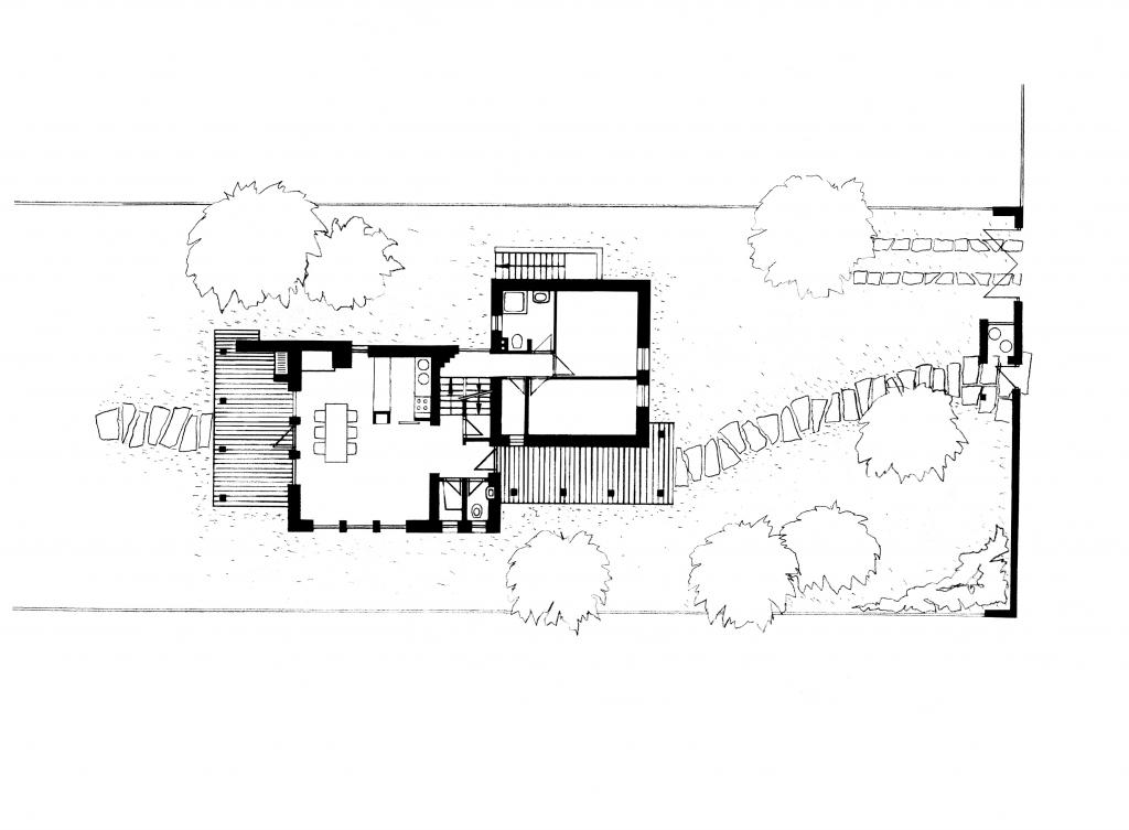 A valamikori hétvégi házas kis telkekből lett a lakóterület, ahová a családi ház épült, egy meglévő kis ház átalakításával és bővítésével. Mivel a meglévő épületrész alápincézett és erősen kiemelt a tereptől (és ezt az új részen nem akartuk követni), ezért a ház szinteltolásos. Így az épület csuklópontjába került az új lépcsőház, a régi és az új rész kapcsolódásához.