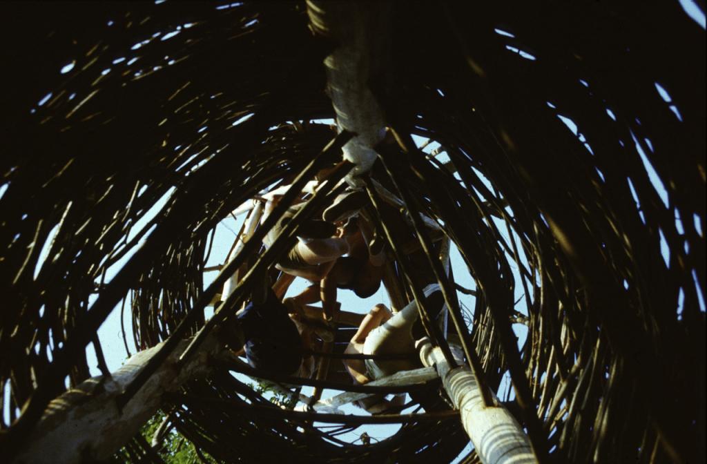 Néhány szó magáról a toronyról: a barlang előtti térség peremén áll, a kb. 6m magasan levő kis teraszról csodálatos panoráma nyílik. Szerkezetét három, fa hevederekkel összeerősített rönkfa alkotja. külső burkolatát vesszőkből fontuk. A tartószerkezetet a földön szereltük össze és kötelek, botok segítségével helyeztük az előre kiásott gödörbe. Ez a munkafázis volt a legnehezebb, de egyben legszebb és legemlékezetesebb.