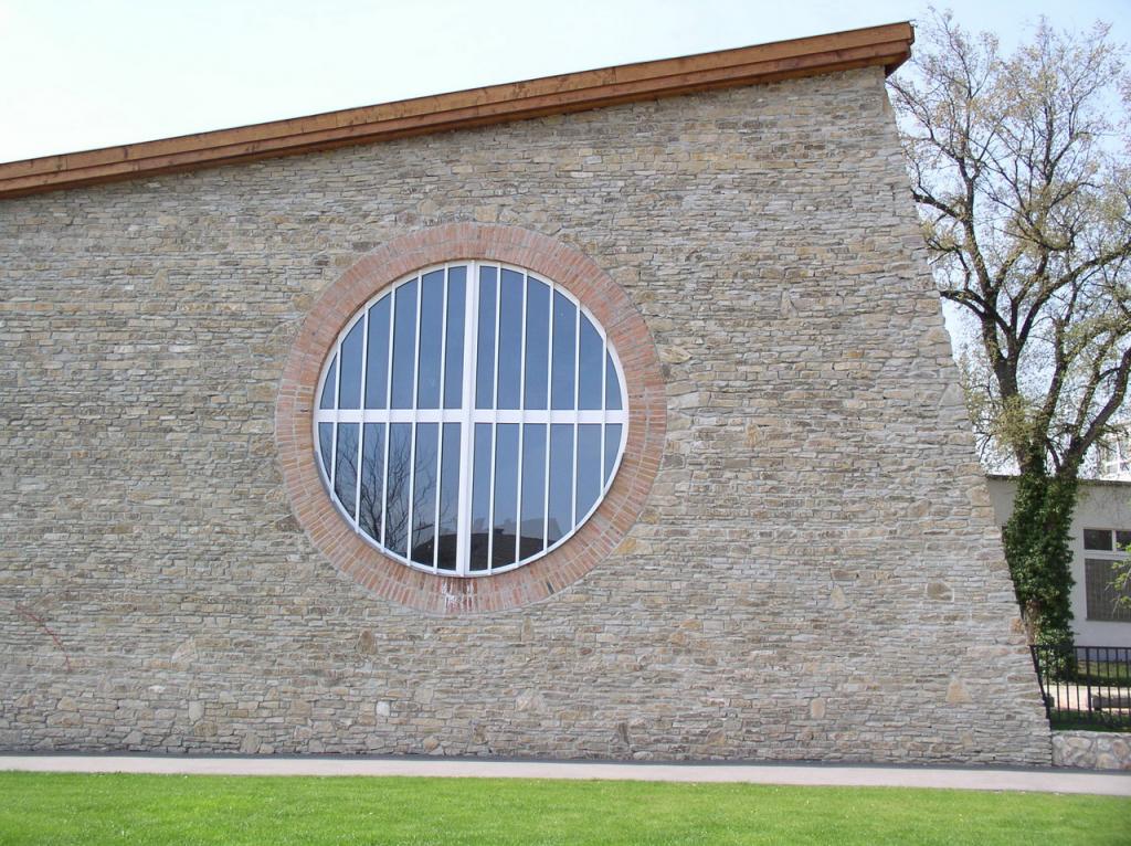 Az épület látszótégla burkolatú, kivéve az előbb említett oromfalat és kerítést, amelyek terméskőből készültek. A ház laposhajlású tetője fémlemez fedésű. A medenceterek fölötti tető egy egyszerű szerkesztésű ragasztott fa főtartókból álló szerkezet.