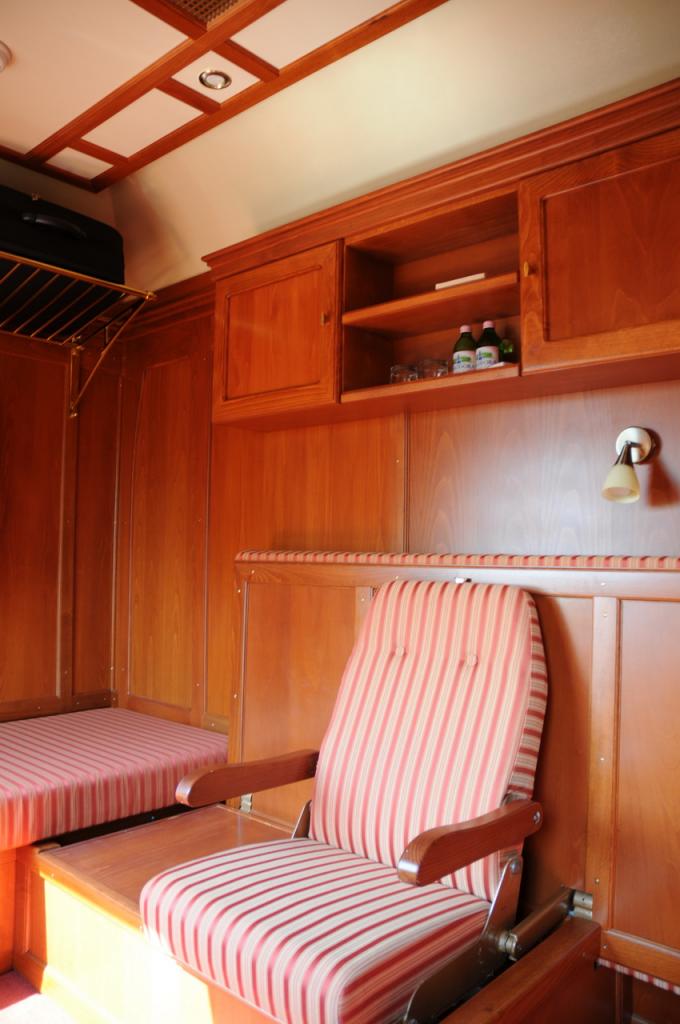 A 2 személyes fülkékben 2 karosszékké alakítható ágy, 1 mobil karszék, szekrény, zárt és nyitott polc található.