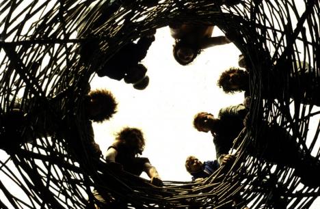 Miután rögzítettük a kétirányú spirál hálózatot kirajzoló vázszerkezetet, vékony vesszőkkel fontuk be. Két bejáratot készítettünk, az egyiket a bányaudvar legnagyobb sziklája - az Oltárkő - irányába, a másikat a tábortűz helyének irányába, ami az előzővel 90°-ot zárt be, ez az augusztus 20-i napfelkelte iránya is.