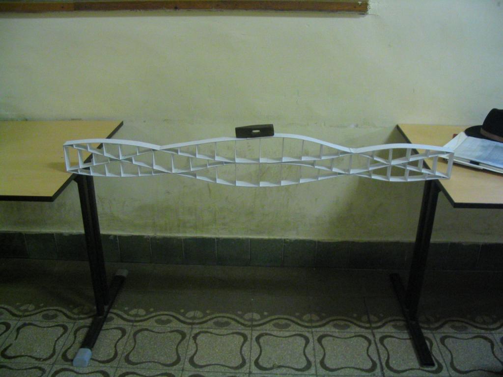 Az adott méretű, 50x70 cm-es triplex kartonból olyan szerkezetet kell készíteni, mely min. 80 cm szabad fesztávot hidal át, közepén 80 dkg. súllyal. A feladathoz a papír ragasztó használható, más segédszerkezet nem alkalmazható. Az áthidaló szerkezetnek stabilnak kell lennie, megtámasztása, merevítése nem megengedett.