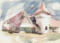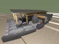 A domboldalba benyomva az épület kiszolgáló racionális részei (konyha, raktárak, öltözők, kazán) egyenes vonalvezetéssel-?szálkák, szárak?. A tetejére ?ráfolyik? a hegy, a zöld (zöldtető). Ebből a ?sötétségből? születnek meg az épület íves karjai, melyek körül ölelik a díszudvart, a főbejáratot...